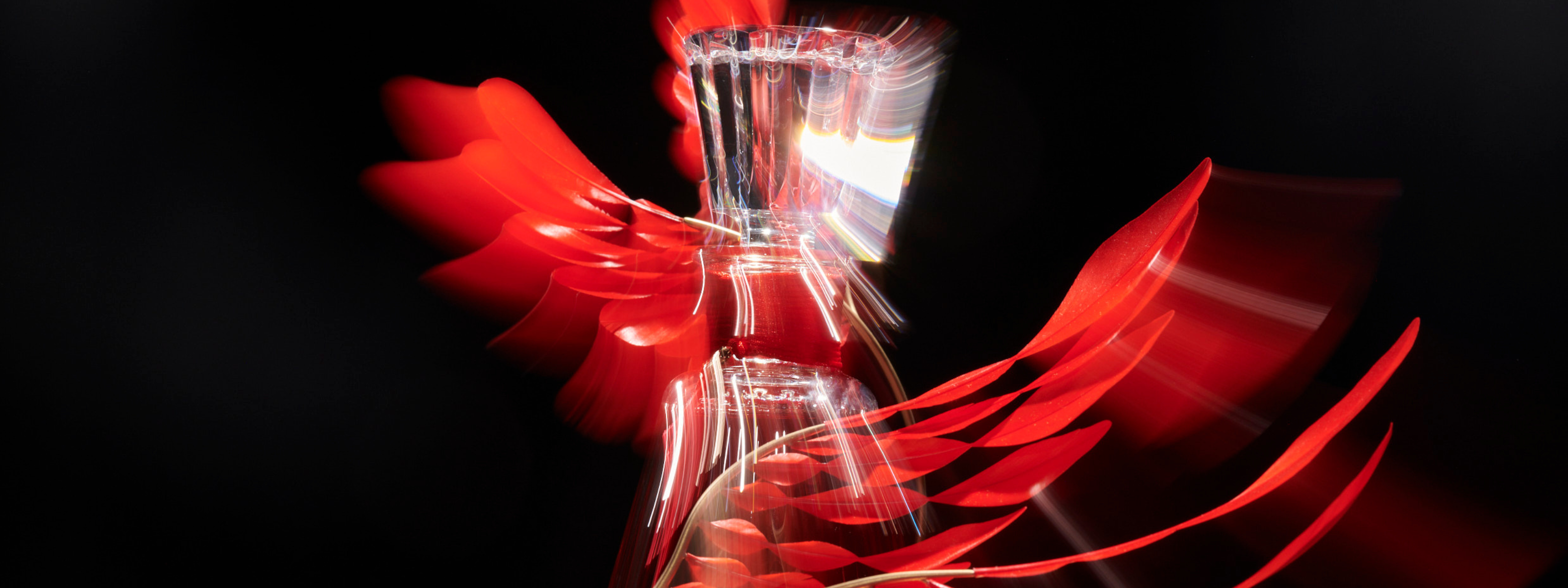 Trois flacons d’environ trente centimètres de hauteur et de profondeur, transformés en Ibis par la grâce de plumes rouges qui, associées au Baccarat des cognacs, soulignent à la fois la douceur, la légèreté et la robustesse de cet échassier des terres lointaines.