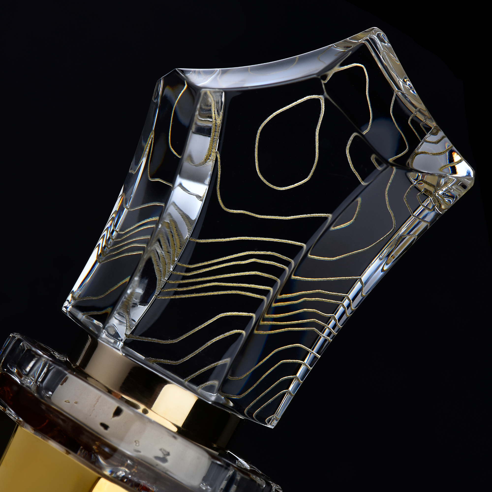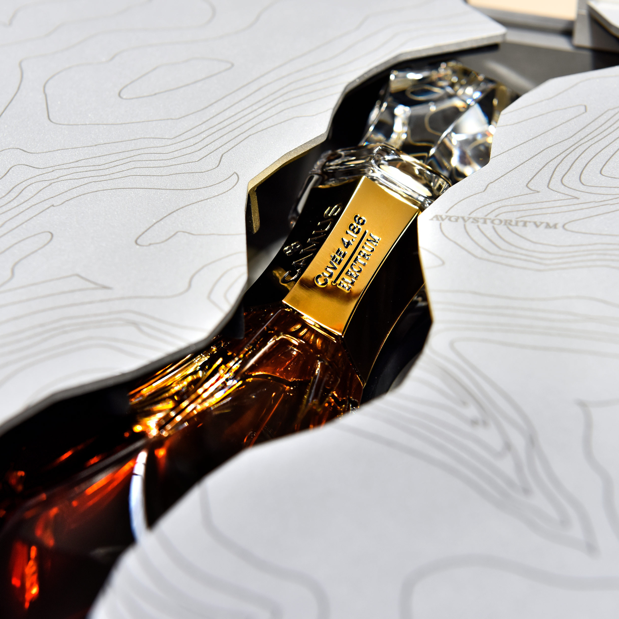 The box houses the iconic decanter designed by Serge Mansau for CAMUS and manufactured by BACCARAT. For Cuvée 4.186, it is decorated with a golden fret which recalls the color of electrum. It fits perfectly inside the box, in a location designed like a mold of its imprint. The box of the Cuvée 4.186 Electrum is decorated with an engraved stone facestone engraved with a quote from Virgil (70-19 BCE).