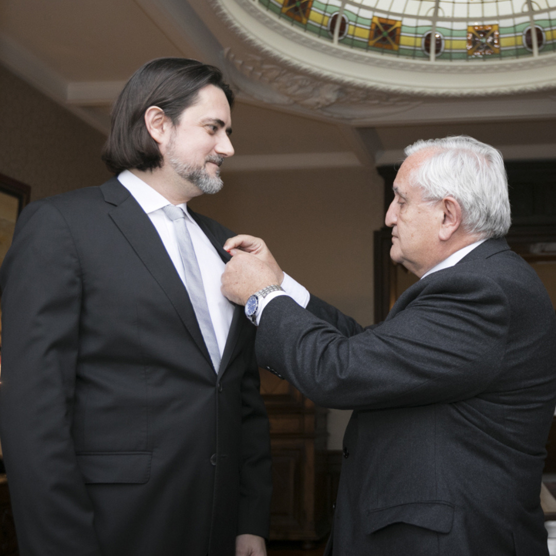 Jean-Pierre Raffarrin remet l'insigne de chevalier de la Légion d'honneur à Cyril Camus qu'il qualifie du "plus chinois des Charentais", manière de saluer les choix stratégiques et la forte croissance réalisés par celui qui incarne la cinquième génération à la tête de l'entreprise familiale.